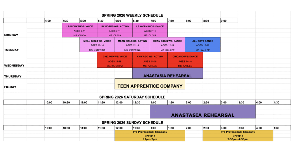 We’ve made exciting updates to our Spring lineup designed with you, the parents, in mind. This year, students can take acting, singing, and dancing all in the same night, making training more convenient than ever. No more juggling multiple days or separate classes because everything is now streamlined into one easy weekly schedule.